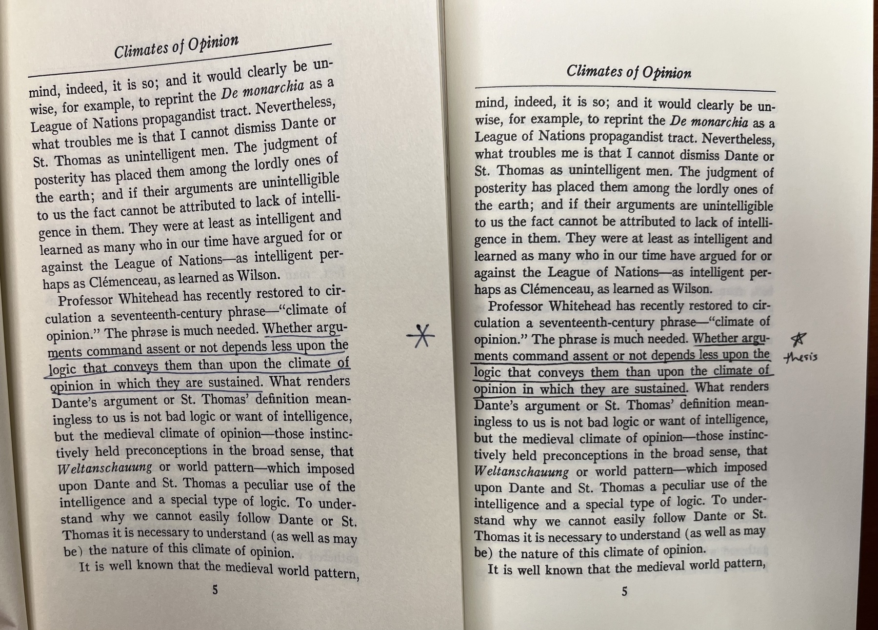 Yesterday on the free books cart in the library, I found a retired colleague’s undergraduate copy of Becker’s Heavenly City of the 18th Century Philosophers (L). Then, in my office, I discovered that some 35 years later, I had underlined the same sentence in my undergraduate copy (R).