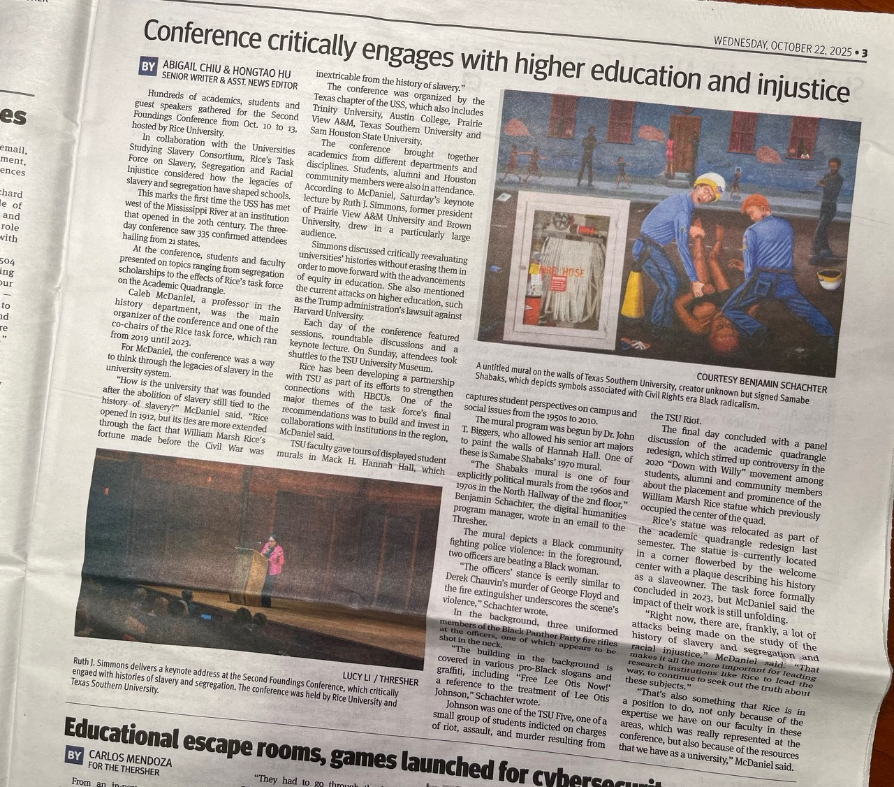 The Rice Thresher has a write-up today about the Second Foundings conference, which wrapped up on October 13. Grateful to all who came!